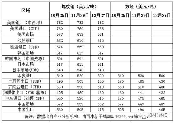 方坯價(jià)格方面:12月份與11月同期相比,土耳其出口報(bào)盤(FOB價(jià))下跌55美元/噸,獨(dú)聯(lián)體出口黑海報(bào)盤(FOB價(jià))下跌19美元/噸;中東市場(chǎng)進(jìn)口價(jià)下跌10美元/噸,東南亞進(jìn)口(CFR)價(jià)格下跌30美元/噸。