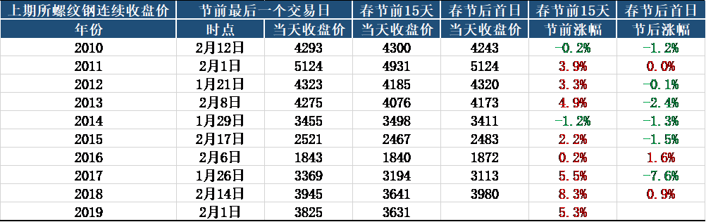 In terms of specific prices, from the comparison of Myspicpugang's price index before and after the Spring Festival in previous years, there are 70 % of the probability that prices will rise and fall on the 15th before and after the last decade. Before the Spring Festival of 2019, the steel price index accumulated a slight increase of 0.4 %, and it is expected that there will be a large probability of a good start.